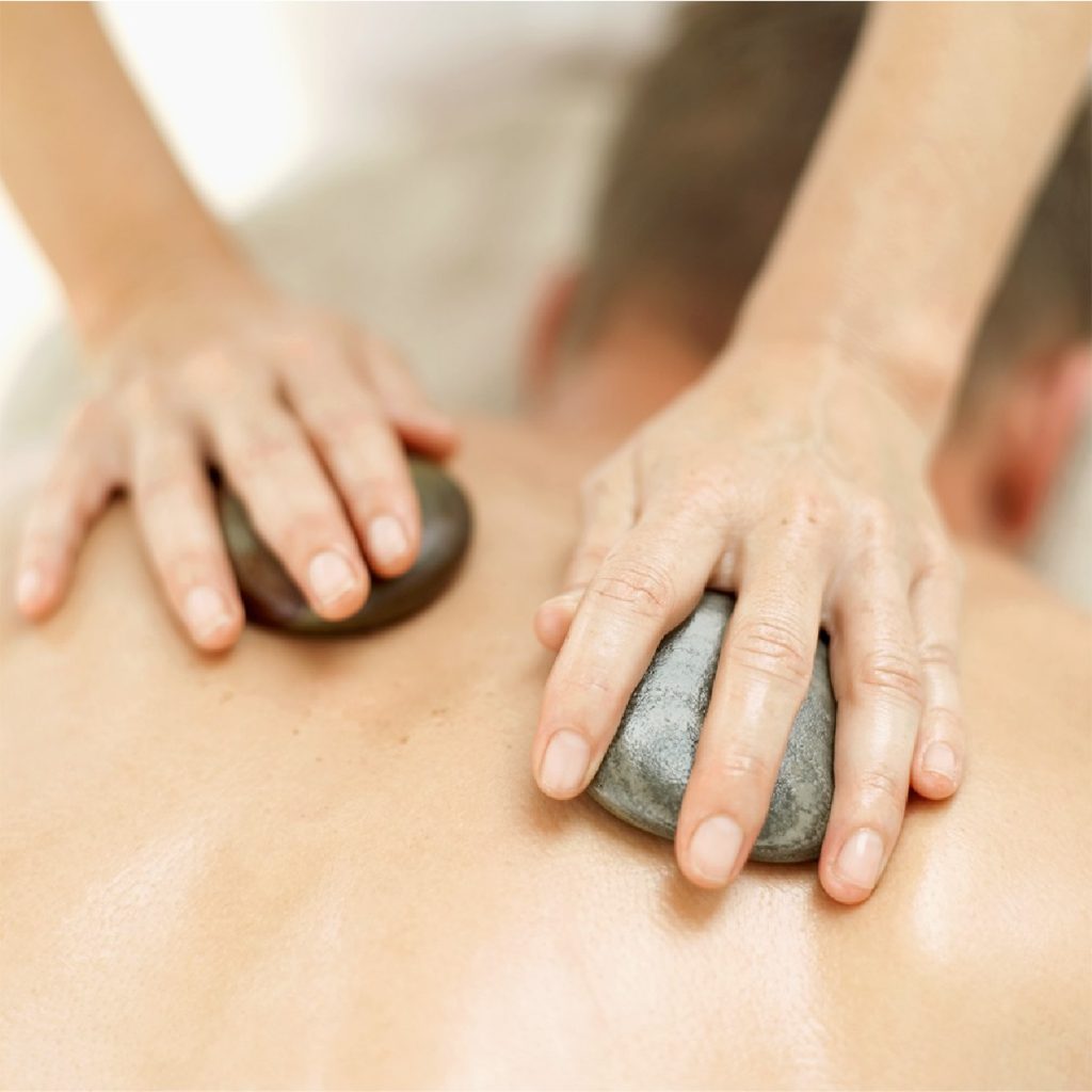 Massagem relaxante, que utiliza a energia das pedras basálticas que ativam processos de cura e de bem estar.